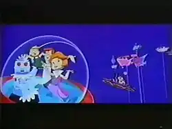The riders fly on a roller-coaster track after the villain, and end up going down a steep drop when Rosie the Robot Maid (flying with the Jetsons) extends her arm and lifts Dastardly and Muttley from their rocket, allowing George to save Elroy. Dastardly and Muttley then get surrounded by thousands of flying cop cars, and both are arrested and dropped in a flying jail cell. The Jetsons thank them, and the riders fly back home through a vortex and crash land back at the station on a giant inflated bumper reading "END". Yogi gives them a rhyming farewell message. "So folks, thanks for joining in the ride, I'll see you on the outside!" A lamp comes down from the top, from which Yogi pulls the light switch which makes the screen go black, ending the ride with the attendants congratulating the riders on a job well done for saving Elroy.