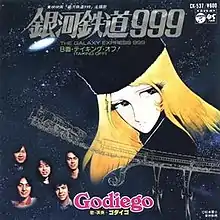 "The Galaxy Express 999" (銀河鉄道999(スリーナイン), Ginga Tetsudō Surī Nain) is a song by Japanese rock band Godiego, released as their 11th single. The song was used as the theme song for the 1979 film adaptation of the manga of the same name. The song was composed by Godiego vocalist Yukihide Takekawa and arranged by Godiego keyboardist Mickie Yoshino. Like many Godiego songs, it is both in Japanese and English; the English lyrics were written by Yōko Narahashi and the Japanese lyrics were written by Keisuke Yamakawa. The song reached #2 on the Oricon charts and was the #1 song on The Best Ten for seven weeks.