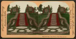 Frederick Nussbaumer, formerly of London's Royal Botanic Gardens, was hired by Como Park in St. Paul Minnesota, where in 1894 he installed the elegant Gates Ajar floral staircase.[29][30] The feature was much photographed, and for decades provided a popular backdrop for wedding photographs.[31] Similar "Gates Ajar" features were found at Washington Park, Chicago, Illinois.[32] and Roger Williams Park, Providence, Rhode Island.[33]