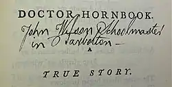 The printed section of 'Burns's' poems followed a protocol personal and many place names were given a degree of anonymity by replacing most letters with asterisks,[14] however to assist the bishop, Burns wrote in the missing letters and he also provides extra details such as the real name of 'Doctor Hornbook' being 'John Wilson Schoolmaster, Tarbolton'. After the 'Lord President Dundas' poem he added a note:
