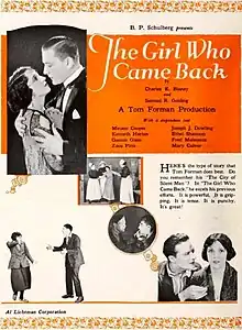 The Girl Who Came Back is a 1923 American silent drama film directed by Tom Forman and starring Miriam Cooper, Gaston Glass and Kenneth Harlan.[1]