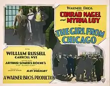 The Girl from Chicago is a lost[1] 1927 American synchronized sound criminal romantic drama film directed by Ray Enright and starring Myrna Loy and Conrad Nagel. While the film has no audible dialog, it was released with a synchronized musical score with sound effects using the Vitaphone sound-on-disc process. The film was produced and distributed by the Warner Bros. and is based upon a short story by Arthur Somers Roche that appeared in the June 1923 Redbook.[2]