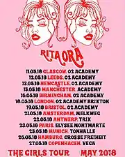 The Girls Tour was the third concert tour by British singer Rita Ora, which served as a prelude to her, then upcoming, second studio album, Phoenix (2018). The promotional concert tour began on 11 May 2018 in Glasgow, Scotland.[1][2][3]