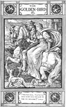 The prince takes the princess, the horse and the golden bird in a cage, the fox at their side. Illustration by Walter Crane in Lucy Crane's translation Household stories from the collection of the Bros. Grimm (1882).