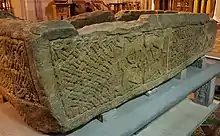 The coffin itself depicts Insular iconography, taking inspiration from different styles that were then popular in the Irish Sea Region. One face of the sarcophagus shows a hunting scene of a horseman chasing a stag, perhaps accompanied by a dog, a motif frequently used in Pictish art that is thought to convey an association with royalty and power. The sarcophagus also shows an animal trampling another two creatures: a snake and what may be a wolf; the angular decoration of the triumphant animal has led many scholars to suggest that this is a ‘Lamb of God’ motif.[25] Two panels depicting beasts in various configurations are found on the other long face of the sarcophagus: in one, four ‘beasts’ are pseudo-mirrored across the vertical and horizontal axes of the panel, though there are differences in each beast's design. In the second panel, two long-necked animals cross necks and interlace their tongue/ears with the other beast's tail; similar motifs, where beasts cross legs, necks, or other body parts, can also be found in Pictish sculpture. The rest of the space on the sarcophagus is filled with panels of median-incised interlace, some of which represent snakes, which a relatively common motif in Insular sculpture, thought to be a symbol of death and resurrection.[26]