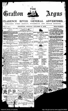 - 1 2 "The Grafton Argus and Clarence River General Advertiser". Trove Digitised Newspapers. National Library of Australia. Retrieved 8 March 2018.