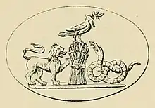 Late antique gem engraved with a wheatsheaf, on which is perched the Dove, placed between its enemies, the Lion and the Serpent = World and Devil.[1]