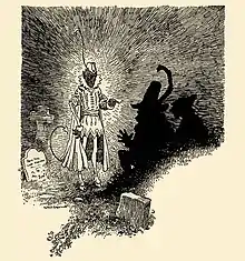 On the third and final night a passing battle-scarred and retired soldier pauses to rest by the churchyard and says he will sit with the poor man and join him in watching over the grave. At midnight the two are disturbed by a shrill whistling which heralds the arrival of the Devil, who has come to claim the rich man's soul. The two defy him, so after threatening them the Devil tries a subtler ruse and bribes the men with an offer of gold into giving up their watch. The soldier says that if the Devil fills his boot with gold they will leave. The Devil departs to fetch the gold and in his absence the soldier takes off his boot and cuts a large hole in the sole.[3][4][5]