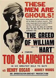 The Greed of William Hart is a 1948 British horror film directed by Oswald Mitchell and starring Tod Slaughter, Henry Oscar, Aubrey Woods, Patrick Addison, Jenny Lynn (star Tod Slaughter's real life wife), Winifred Melville and Arnold Bell.[1] The film depicts two Edinburgh bodysnatchers closely modeled on the real Burke and Hare.