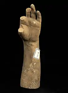 Master carvers then used the durable plaster cast as a measuring tool, covering the surface of the plaster cast with hundreds of pencil marks and metal pins, or points, which served as registration marks for a pointing machine. The pointing machine was moved repeatedly from the points on the plaster cast to corresponding areas on a block of marble to guide the carver's tools as he translated the composition into marble.[13] The tool would then be moved, over and over again, hundreds of times, from the points on the plaster to the corresponding locations on the block of marble. Each time, the tool would measure the depth and location on the marble block, creating a three-dimensional guide that helped the marble carver replicate the artist's original form more quickly and with greater ease.[15] When creating the finished marble versions, fine details such as the cross, locket, and chains were finalised, and differ slightly among the marble versions. The Smithsonian American Art Museum holds the original 1843 pointed-plaster mold, along with numerous smaller casts from Powers' studio.[3]