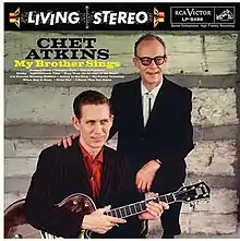 In 1958, Atkins decided to record an album with his brother Jim, once a vocalist in the Les Paul Trio and for Fred Waring and His Pennsylvanians. The album was recorded July 24 and August 29, 1958 in Nashville and was to be called My Brother Sings. It was completed, printed and pressed before being pulled from distribution for unknown reasons. All copies of the album were to be destroyed. Four of the instrumentals that were recorded appeared on the Atkins' 1959 album Mister Guitar. Five of Jim Atkins' vocal tracks were released on The Guitar Genius on the budget label Camden in 1963. Rare copies of the original album were discovered in the hands of collectors. The backing band was credited as The Rhythm Rockers, which consisted of session musicians Bob Moore, Floyd Cramer and Buddy Harman. In 1963, five of the Jim Atkins vocal tracks were issued along with five instrumentals by Chet. In 2015, My Brother Sings was released by Sundazed Records after the location of the original tapes and remastering.[2]