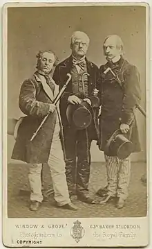 As in The Wicked World and several other Gilbert works, the play concerns chaos that is wreaked in Fairyland when an element of life in the mortal world is imported.[4] In The Wicked World, this element is "mortal love", while in The Happy Land, it is "popular government", which is delivered to Fairyland by Gladstone, Lowe, and Ayrton. Stedman calls this a "Gilbertian invasion plot".[5] The three men depicted, and clearly identified by their make-up and by costumes designed after contemporary cartoons in Vanity Fair, were, respectively, Britain's Prime Minister, Chancellor of the Exchequer and First Commissioner of Works. The three characters were described in the cast list as Mr. G., Mr. L., and Mr. A. Gladstone's government is portrayed as mean and uncaring of Britain's national interests, degrading British prestige abroad. The three men are seen to lack substance and taste.[6] The daring political attack was almost unprecedented on the English stage. The opening night response was described by Edward Righton, who played "Mr. A.":