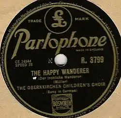 Die Isarspatzen, Herbert Beckh und das Tanzorchester des Bayerischer Rundfunks München have recorded a German version of the song "Der fröhliche Wanderer". Electrola released that recording in 1955 as catalog number EG 8082.[5][6][7]