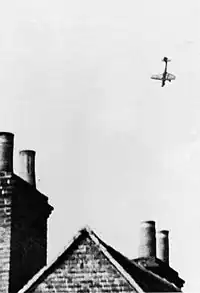 As the bombers worked over the airfield, Aircraftman D. Roberts waited for them on the northern boundary with his parachute-and-cable launchers. Three Do 17s were heading towards him, climbing slowly. When they were in range he fired the cables. Nine rockets flew upwards. Wilhelm Raab saw the rockets go up. Although he did not understand what they were, he banked the Do 17 to avoid the lines of smoke that may or may not have concealed something. Because the Dornier banked, one of the cables that hit his bomber slid off the wing before the lower parachute had time to deploy. Pilot Petersen's Dornier was not that lucky. Already on fire it ran into the cable which dragged it out of the sky. The Do 17 crashed killing all five crewmen.[65] Oberleutnant Rudolf Lamberty (carrying Joachim Roth) also managed to avoid a collision, but before he could do so ground fire hit his Dornier destroying the fuel tanks. The bomber caught fire and he was barely able to keep control.[66] Eventually it crash-landed at Leaves Green in Kent after being shot down by No. 111 Squadron Hurricanes.[62] Roth was killed, but Lamberty survived with burns.[67]