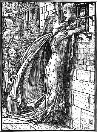 Illustration by Walter Crane for The Heart of Princess Joan, depicting Joan realizing Prince Michael is her beloved.