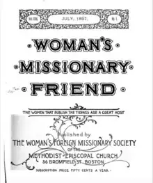 The Heathen Woman's Friend (1869-1896; renamed Woman's Missionary Friend, 1896–1940) was a Christian women's monthly newspaper. Established in May 1869, it was published by the Woman's Foreign Missionary Society of the Methodist Episcopal Church in Boston, Massachusetts. The monthly magazine describe conditions in the mission fields of the church, document the work of the society, and provide assistance to missionaries. The Heathen Woman's Friend was launched with volume 1, number 1 in May 1869. Its final issue, volume 27, number 6, was issued December 1895. The publication was relaunched as the Woman's Missionary Friend with volume 27, number 7 in January 1896, and ended with volume 73, number 7 in August 1940.
