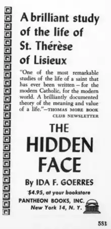 The Hidden Face is a biography of Saint Thérèse of Lisieux by the Catholic author Ida Friederike Görres (1901 Bohemia – 1971 Germany). Görres first published this book in German in 1944 as Das Verborgene Antlitz;[1] in the eighth edition in German in 1958, it was renamed Das Senfkorn von Lisieux: Das verborgene Antlitz. Neue Deutung in German.[2] An English version, translated by Richard and Clara Winston, was published in 1959;[3] this was republished by Ignatius Press in 2003.[4] The Hidden Face is considered to be Görres's most important work.[5]