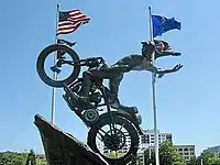 The Hillclimber is a 5,000 pound bronze welded sculpture that stands 16 feet tall and was created by Jeff Decker. Decker is a Utah-based artist, historian and Harley enthusiast. This sculpture is an enlarged life and 1/2 size of his original called, By the Horns; a sculpture referencing the similarities of bull riding and the sport hill climbing.[1] This was a somewhat collaborative piece done with painter David Uhl, another artist licensed by Harley-Davidson. The rider is shown participating in a sport called hillclimbing, popular in the 1920s and 30s. The figure is free of fear in his eyes as one foot is being swept off the bike and his right arm extends backwards."He is crashing," Decker said of the helmet less young rider. "But every hillclimber crashes. It's part of the race."[2] Hillclimbers were known to race up hills nicknamed the “widow maker” because of the danger and high rate of injury involved in this sport. The sculpture portrays a vintage Harley rider frozen in a skyward wheelie on a DAH bike, one of only six in the world. A documentation to the artist's friendship with Willie and Nancy Davidson can be seen on the gear drive that is inscribed with "Willie G."