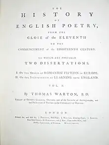 The History of English Poetry, from the Close of the Eleventh to the Commencement of the Eighteenth Century (1774-1781) by Thomas Warton was a pioneering and influential literary history. Only three full volumes were ever published, going as far as Queen Elizabeth's reign, but their account of English poetry in the Late Middle Ages and Renaissance was unrivalled for many years, and played a part in steering British literary taste towards Romanticism. It is generally acknowledged to be the first narrative English literary history.[1][2][3]