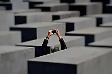 Tourist taking a photograph of the Memorial to the Murdered Jews of Europe in Berlin
