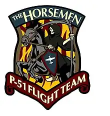 Since their formation in 1994,[4] The Horsemen have utilized the insignia of the grim reaper on a horse bearing a shield with an emblem of the P-51 on the front of it. Since the addition of Steve Hinton to the team, the logo has also been altered to have the emblem of the F-86. The imagery is meant to represent the Four Horsemen of the Apocalypse, though Ed Shipley is quoted as saying that the name was inspired by a Metallica song.