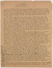 - ↑ Lovecraft, Selected Letters, Vol. I p. 98; quoted in Steven J. Mariconda, "'The Hound'--a Dead Dog?" in The Horror of It All, Robert M. Price, ed., p. 49.
