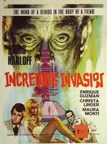 The Incredible Invasion (Invasion siniestra/ The Sinister Invasion), also known as Alien Terror, is a 1968 Mexican science fiction film directed by Luis Enrique Vergara. It stars Boris Karloff, Yerye Beirute and Enrique Guzmán.[2] It is the last film Karloff worked on before his death in 1969. It was filmed in May 1968, but was only released theatrically in 1971, 2 years after Karloff had died.[1][3]