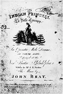 Much of the known background about the piece comes from a letter Barker wrote to William Dunlop, dated June 10, 1832. In it, he indicates that he had been working on The Indian Princess for a number of years before it was first produced in 1808. In fact in 1805, he wrote a Masque entitled "America" (which has not survived) that he intended to serve as a conclusion to the play, in which characters called "America," "Science," and "Liberty" sing and engage in political debate.[4][5] Barker originally intended the piece as a play without music,[6] but John Bray, an actor/translator/composer[2] employed by The New Theatre in Philadelphia, convinced him to add a musical score.[7]