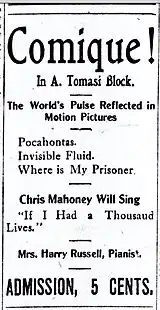 - ↑ "At the Orpheum Tonight", East Oregonian (Pendleton, Oregon), November 13, 1909, p. 5, col. 4. Retrieved via Chronicling America: Historic American Newspapers, online database co-sponsored by the Library of Congress and the National Endowment for the Humanities (Washington, D.C.), June 15, 2023;