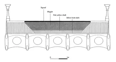 The infill of the bridge between the deck and road surface was examined in 1998 as was found to be made up of; a single layer of yellow bricks, 15cm of chalk, 40cm of hoggin, finished with 5cm of topsoil with slight different composition at the abutments. It is believed that this material dates from the original construction.[10]