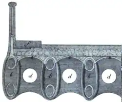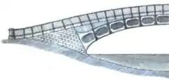 ...hollow pieces of cast iron in a longitudinal direction and plates or pipes of the same material, having sockets on them, to receive the ends or shoulders of the said pipes, tubes, or other hollow pieces, placed transversely; and extending from one side of the bridge to the other, so that when the required number of pipes, tubes, or other hollow pieces of cast-iron, and of transverse places, or pieces, are put together they form the arch, and so firmly fix, connect, and unite, all the parts, as not to require the aid of screws, bolts, cramps, or any wrought-iron fastenings whatever; but, for the sake of giving the joins a more equal bearing, it will be proper to run lead or cement into them.[3]