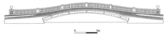 The bridge at Culford follows this design with 5 cast iron voussoirs making up one segment arc which is repeated six times forming the 60 ft span connected with socketed joints. Arched plates between the ribs carry the infill up to roadway level with channelled granite abutments on either side. Masonry balustrades line the edge of the bridge 20 ft wide with carved marble urns at the ends.[4]