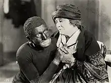 Seymour Stark's view is less sanguine. In describing Jolson's extensive experience performing in blackface in stage musicals, he asserts, "The immigrant Jew as Broadway star...works within a blackface minstrel tradition that obscures his Jewish pedigree, but proclaims his white identity. Jolson's slight Yiddish accent was hidden by a Southern veneer."[48] Arguing that The Jazz Singer actually avoids honestly dealing with the tension between American assimilation and Jewish identity, he claims that its "covert message...is that the symbol of blackface provides the Jewish immigrant with the same rights and privileges accorded to earlier generations of European immigrants initiated into the rituals of the minstrel show."[49]