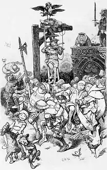 The Jew then offers the youth a handsome sum of money to stop playing the fiddle, which he accepts, mocking the Jew by complimenting him on his fine dancing style. The Jew subsequently seeks out a magistrate and lodges a complaint against the servant, claiming that the servant stole the money. After enquiries are made, the youth is arrested for extortion; he is tried and condemned to hang from the gallows. He asks a final favour: to be allowed to play his fiddle. The Jew protests vigorously but the judge grants the youth's request and the townsfolk are enchanted into manic dancing, which will not end until the Jew states that the money was not stolen. The youth is released and asks the Jew where he had gotten the money. The Jew confesses to have stolen it and is hanged in the servant's place.[6][7][8]
