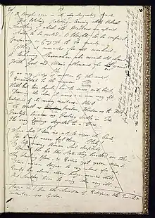 The Lord Byron papers are made up of the manuscripts, business papers, and correspondence of one of the most significant authors to be published by the House of John Murray – George Gordon Noel Byron, or Lord Byron. This collection is the largest of its kind, containing over 10,000 items related to Byron. On 10 March 1812 Murray published Byron's Childe Harold's Pilgrimage, which sold out in just a few days. This led to Byron's famous reference to its instantaneous success, 'I awoke one morning and found myself famous.'[7] After its publication, Byron and Murray became good friends and their relationship is the reason why the Archive contains more than just Byron's works – his personal papers were collected by the Murray family over the years. This series contains the manuscripts of Childe Harold's Pilgrimage itself as well as manuscripts and drafts of most of Byron's other work, many of which have been put on display at various exhibitions like the National Library of Scotland's 'Such Seductive Poetry' exhibition (18 April 2019 – 27 July 2019) which featured letters written and received by Byron, as well as the manuscript of Don Juan (cantos I, II and V) with his annotations and additions.[8][9]