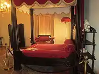 One of the five bedrooms has a red quilt on the bed. This room was occupied by the daughter who had become engaged to marry; this daughter would remain there until the day of her wedding. Her sisters, except for Willie May as it developed, would then occupy that room once they became engaged and remain there until their own weddings. Three daughters were married in the house, the first, Sadie (1886-1960), wed Orville Bullington in 1911; two others chose local churches for their ceremonies. The Kells were Presbyterians though the house coincidentally is across the street from part of the First Baptist Church complex. The wedding receptions were held at the country club. Despite a fire in one bedroom in the 1970s, the house was quickly restored. A second bed in the master bedroom was used for a child whenever the Kells had overnight guests.[2]