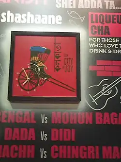 The restaurant appears in a single-floor house. The interior decoration has been done following the culture and famous places and events of Kolkata. Suresh was into advertising agency before starting this place. He told: "We wanted the place to seem homely and welcoming to anyone who steps into the place. There's a pinch of Kolkata in everything here". The billing desk looks a bus in Kolkata and it is named On one side of the order counter there are a few framed photos capturing Kolkata trams, portrait of Bengali-director Satyajit Ray, Bengali comic characters Hada Bhoda, Bengali adda. There are also graffiti, scribbles and Bengali quotes and phrases such as Awesome Saala!, Amake amar moto thakte dao (leave me to myself), Dada vs Didi, Ilish vs Chingri. Bengali or Hindi songs are played in the main restaurant area.[1][2][3]