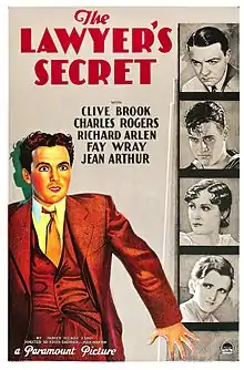 The Lawyer's Secret is a 1931 American pre-Code crime film directed by Louis J. Gasnier and Max Marcin and written by Lloyd Corrigan, James Hilary Finn, and Max Marcin. The film stars Clive Brook, Charles "Buddy" Rogers, Richard Arlen, Fay Wray, Jean Arthur, Francis McDonald, and Harold Goodwin. The film was released on June 6, 1931, by Paramount Pictures.[1][2]