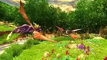 Spyro retains his command of fire, electricity, ice and earth (all of which he now has access to from the start), while Cynder controls poison, fear, wind and shadow. Powers, that were given to her, when she was controlled by the Dark Master. Cynder is faster, yet weaker than Spyro. Along with the standard power-ups that gems can cause, Spyro and Cynder can both equip pieces of Dragon-armor, that they'd find. They also have another feature called melee combos. The more times, the player hits the enemy, the more blue Gems the players will earn. Blue Gems will power up Spyro and Cynder, allowing them to upgrade moves. Along with Blue Gems, there are also Red gems, which restore lost health. The green gems will give the dragons their magic, allowing to charge their element attacks. The Fury Gems, known from previous titles, have been replaced by dark crystals, that can drain magic, if they're not destroyed. The Fury-Meter now goes up, depending on the number of times, Spyro or Cynder score attacks on enemies. In addition to normal enemies, there are elite enemies, which are enemies, that are stronger than normal ones. Their masks give them invincibility to normal attacks. The player must use an element of a designated color, that matches that of the mask, in order to knock the mask off. Once kicked off, normal attacks and other elemental powers will be allowed.