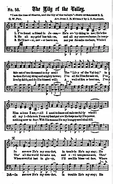 "The Lily of the Valley" ("I've Found a Friend in Jesus") is a Christian hymn written by William Charles Fry (1837–1882) in London for the Salvation Army.[1] Ira D. Sankey arranged the words to the music of "The Little Old Log Cabin In The Lane" composed by Will Hays.
