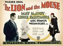 The Lion and the Mouse (1928) is a sound part-talkie drama film produced by Warner Bros., directed by Lloyd Bacon, and based on the 1905 play by Charles Klein.[2] In addition to sequences with audible dialogue or talking sequences, the film features a synchronized musical score and sound effects along with English intertitles. The soundtrack was recorded using the Vitaphone sound-on-disc system. The film marks the first time Lionel Barrymore, who was on loan out from MGM, spoke from the screen.