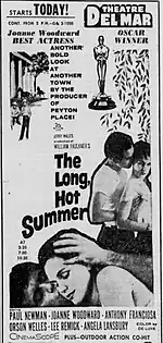 The Long, Hot Summer is a 1958 American drama film starring Paul Newman, Joanne Woodward, Anthony Franciosa, and Orson Welles. It was directed by Martin Ritt, with a screenplay by Irving Ravetch and Harriet Frank Jr., based in part on three works by William Faulkner: the 1931 novella "Spotted Horses", the 1939 short story "Barn Burning" and the 1940 novel The Hamlet. The title is taken from The Hamlet, as Book Three is called "The Long Summer". Some characters, as well as tone, were inspired by Tennessee Williams' 1955 play, Cat on a Hot Tin Roof, a film adaptation of which – also starring Newman – was released five months later.[3]