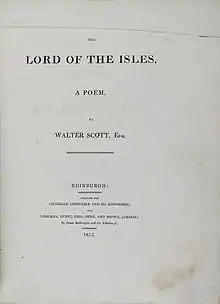 The Lord of the Isles is a narrative poem by Walter Scott in six cantos with substantial notes. Set in 1307 and 1314 Scotland it covers the story of Robert the Bruce from his return from exile in Ireland to the successful culmination of his struggle to secure Scottish independence from English control at the Battle of Bannockburn. Interwoven with this account is a romantic fiction centring on one of the Bruce's prominent supporters, Ronald, Lord of the Isles, involving his love for the Bruce's sister Isabel, who eventually takes the veil, and the transfer of his affections to Edith of Lorn to whom he had been betrothed at the beginning of the poem and whom he marries at the end.