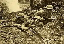 Still from the American war film The Lost Battalion (1919), on page 1947 of the June 28, 1919 Moving Picture World. Men who fought with the 77th Infantry Division in France acted in the film.