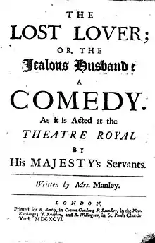 The Lost Lover; or The Jealous Husband: A Comedy, Delarivier Manley's first published play, was performed in March 1696 at Theatre Royal, Drury Lane. The performance ran only three nights.[1]