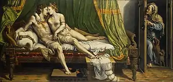 The Lovers, Two Lovers or Love Scene is an oil painting by Giulio Romano, originally painted on panel and later transferred to canvas by A Mitrokin in 1834. Since it was poorly stored and kept off public display due to its subject matter until 1920, it has significant damage, including three large breaks in the canvas sealed with coarse plasters on the reverse and other damage to the paint and varnish layer both before and after the transfer[1] It now hangs in the Hermitage Museum.