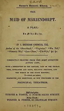 The Maid of Mariendorpt is an 1838 play by the Irish writer James Sheridan Knowles. It was inspired by the 1821 novel The Village of Mariendorpt by Anna Maria Porter.[1] It premiered at the Theatre Royal, Haymarket in London on 8 October 1838.[2] The original cast included Sheridan Knowles as Muldenhau, Robert Strickland as General Kleiner, Walter Lacy as Baron Idenstein, Benjamin Nottingham Webster as Joseph, John Buckstone as Hans, Fanny Cooper as Adolpha, Emma Elphinstone as Meeta, Julia Glover as Esther. The same year it appeared at the Walnut Street Theatre in Philadelphia.[3]