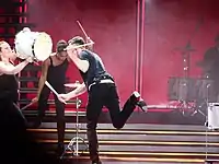 Warren Carlyle was signed as the creative director for the show, while Ashley Wallen choreographed the dancers through intricate dance steps.[20] The large main stage was elevated and set up at the end of the arenas, with a long runway extending from its middle, the pathway ended into a round-shaped front.[21] The tour featured costumes from Tom Ford including, a black snake-print velvet jacket, a metallic silver jacket and an ensemble of white shirt with pleated bib, silk-satin cummerbund and black fedora.[22][23][24][25][26]