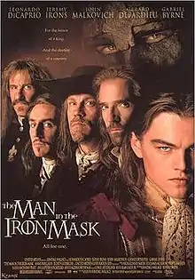 The Man in the Iron Mask is a 1998 American action drama film written, directed, and produced by Randall Wallace in his directional debut. It stars Leonardo DiCaprio in a dual role as the title character and the villain, Jeremy Irons as Aramis, John Malkovich as Athos, Gérard Depardieu as Porthos, and Gabriel Byrne as D'Artagnan.[4] Some characters are from Alexandre Dumas's D'Artagnan Romances and some plot elements are very loosely adapted from his 1847-1850 novel The Vicomte de Bragelonne. This was Leonardo DiCaprio's first film following the success of Titanic (1997).