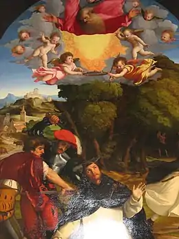 Titian won the competition but the congregation of flagellants ("disciplini") in Alzano was looking for a work to be their high altarpiece for their new church dedicated to Saint Peter Martyr and showed interest in Palma Vecchio's work.[3] That church was rebuilt in 1510–1529 and the work may have been acquired during those years. The altarpiece in which the work was placed to complete the apse was probably designed by Pietro Isabello, Palma's friend and contemporary, who had also designed the church.[4]